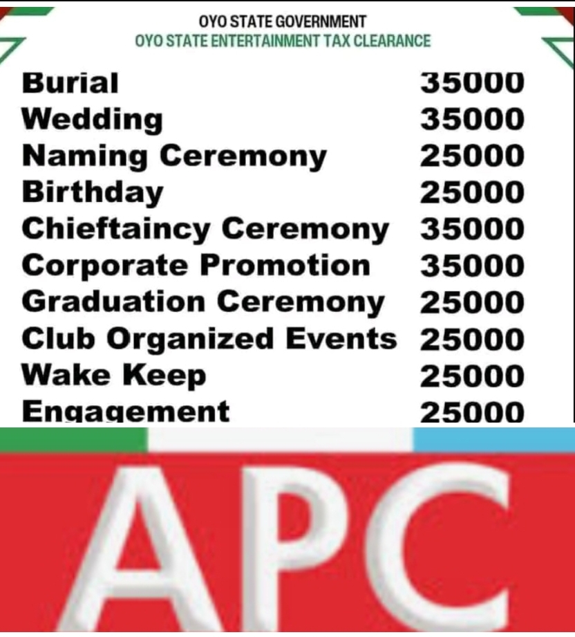 CONTROVERSY IN OYO: APC Slams Govt Over New N35,000 Levies On Burial, Wedding, Chieftaincy Titles
